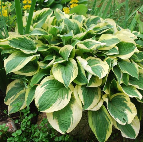 (Wide Brim) Высота куста 60см, ширина – до 70-90см. Листья крупные (17х12см), зеленой окраски с широкой неравномерной кремово-белой каймой. Цветки бледно-лавандовые, с приятным ароматом.