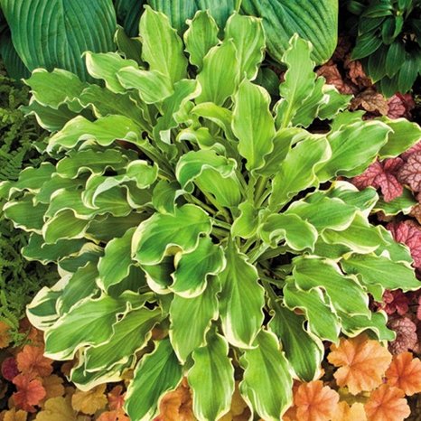Игривый сорт хосты с гофрированными листьями, создающий веселое настроение! Средняя хоста. Высота куста 40-50 см, ширина 65-75 см. Листья плотные, длинные, светло-зеленые, с сильно гофрированным волнистым краем золотисто-кремового оттенка. Цветки колокольчатые, лавандовой окраски, размером 3-4 см, собраны в кистевидные соцветия на прямостоячих цветоносах."