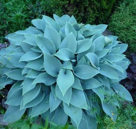 Высота растения 70 см. Ширина куста 90-120 см. Листья огромные (36х25 см), широко яйцевидной формы с острыми кончиками, «пузырчатые», голубовато-зеленые. Голубая окраска более интенсивна в тени. Соцветие компактное, плотное, как у гиацинта. Цветонос почти не возвышается над листьями. Цветки восковые, почти белой окраски с едва сиреневым оттенком, крупные, до 5 см. Зацветает в конце июня.