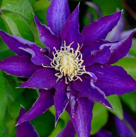 Очень оригинальный японский сорт с фиолетовыми цветками и пучком кремовых, исключительно длинных тычинок по середине. Цветёт в мае-июне и повторно в августе. Компактный рост, хорош для выращивания в контейнерах.