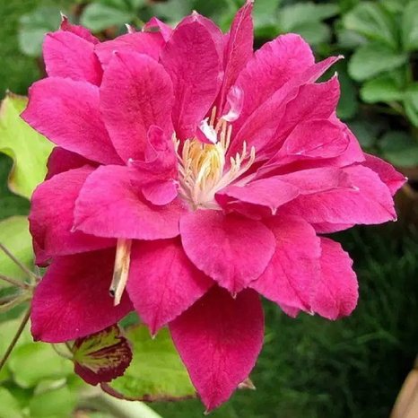 Многолетнеее травянистое красивоцвету. Японский, всегда махровый сорт. Цветки диаметром 10-14см. Лепестки светло-красные, с розовой полоской по середине, все более светлые в направлении основания. Тычинки с пурпурными пыльниками на кремово-желтых нитях. Цветет на побегах прошлого и текущего года (2-й способ). Как правило цветки на побегах прошлого года махровые, на побегах текущего года — полумахровые. Период цветения: май-июнь, повторно в сентябре. Месторасположение: солнечные или слегка затененные в полуденные часы, защищенные от ветра участки. Не пригодны заболоченные участки, участки с высоким уровнем грунтовых вод. Планируя посадку клематисов, нужно продумать естественный отток воды от куста: подсыпать землю, посадить кусты на гряды или прорыть канавки с уклоном. Клематисы могут расти на одном месте более 20 лет. Почва: предпочитают плодородные супесчаные или суглинистые почвы, богатые перегноем, от слабощелочной до слабокислой реакции. Посадка: до посадки клематисы хранят, в торфе или песке, в прохладн