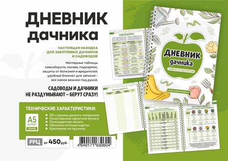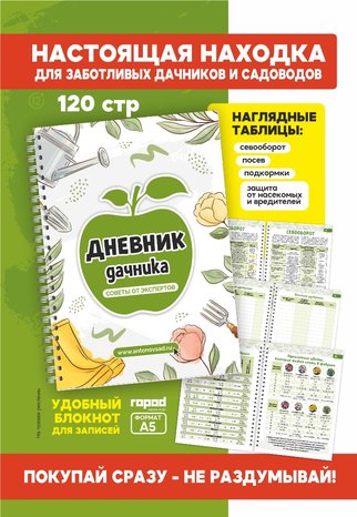 Настоящая находка для заботливых дачников и садоводов!Блокнот для записей, Формат А5, 120 страниц полезной информации - Севооборот, посев, подкормки, защита растений.Главный редактор Охотникова Наталья, она же гл.редактор журналов Дачный клуб, 6 соток в Сибири и садовод - огородник, соавтор Новикова Екатерина - садовод любитель с 25 летним стажем, которая и является родоначальником данного продукта, консультант - Соловьева Анна Евгеньевна - доктор сельско-хозяйственных наук.