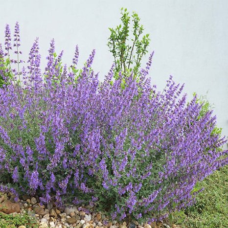 Цветение очень обильное и продолжительное — с июня по сентябрь. Цветки мелкие, лавандово-синие или фиолетово-голубые, собраны в длинные колосовидные соцветия.