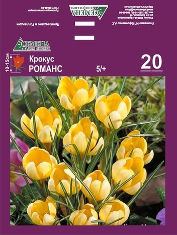 Крокус Романс (Romance)Высота растения 10-15 см. Цветки бокаловидной формы, направленны вверх, диаметром 3-4 см, желтой окраски.