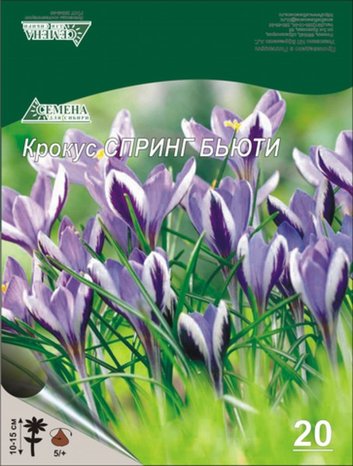 Крокус Спринг Бьюти (Spring Beauty)Крупноцветковый. Высота растения 10-15 см. Цветки бокаловидной формы, направленны вверх, диаметром 4-5 см. Внешние лепестки темно-фиолетовой окраски с сиреневой каймой, внутренние — сиреневые.