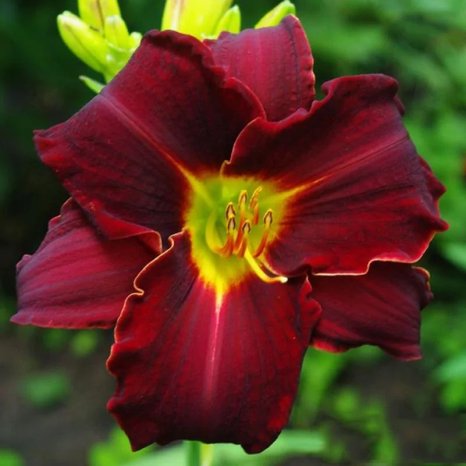 Высота растения 70 см. Цветки крупные, до 11 см, бархатные, темно бордовой окраски с зеленым горлом.