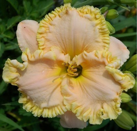 Лилейник Энчантид Форест (Enchanted Forest) Высота растения 70-75 см. Цветки крупные, диаметром 15 см, кремовые с золотистой гофрированной окантовкой и глазком, очень ароматные. Повторноцветущий.