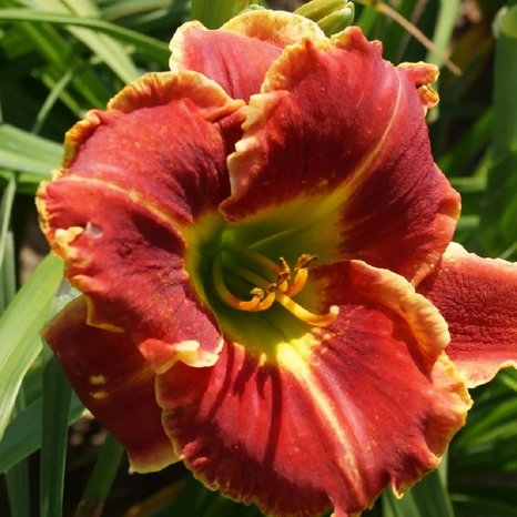 Лилейник Файер энд Фог (Hemerocallis Fire and Fog) Высота растения 65 см. Цветки до 15 см в диаметре, ярко-красной окраски, с тонкой гофрированной золотистой каймой и зеленым горлом. Повторноцветущий.