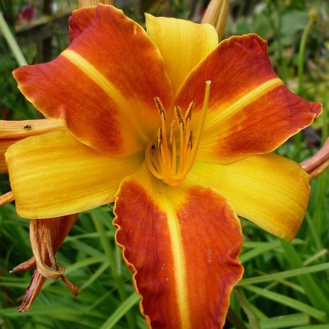 (Frans Hals) Высота растения 65см. Цветки двухцветные: внутренние лепестки красные с желтой полосой по центру, внешние - оранжево-желтые, диаметром до 15см.