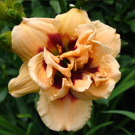 Лилейник Росвифа (Roswitha) Высота растения 40 см. Цветки махровые, диаметром 8 см, кремово-персиковые с темно-бордовым центром.