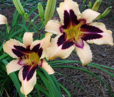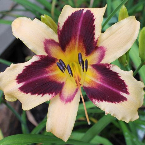 Лилейник Вайлд Хорсес (Hemerocallis Wild Horses) Высота растения 90 см. Цветки диаметром 18 см, кремовые с большой пурпурной звездой и зелено-жёлтым горлом. Лепестки слегка гофрированные. Повторноцветущий.