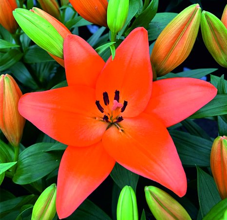 Лилия Бароло (Lilium Barolo)ЛА-гибрид. Вегетационный период 80-90 дней. Высота растения 100-110 см. Цветки направлены вверх, насыщенно-оранжевой окраски, диаметром 14-18 см.