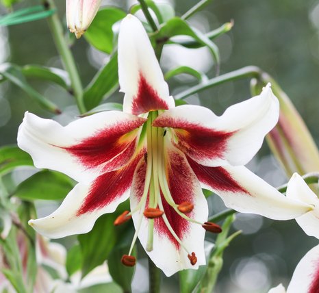Лилия Беверли Дрим (Beverly Dream) ОТ-гибрид. Вегетационный период 100-110 дней. Высота растения 100-110 см. Цветки крупные, диаметром 20-25 см, белой окраски с винно-красной звездой и зелено-желтым горлом. Лепестки широкие, кончики эллегантно отогнуты назад.