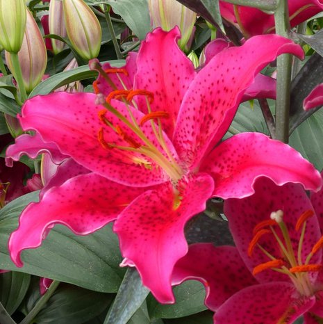 Восточный гибрид. Вегетационный период 120-130 дней. Высота растения 120-130 см. На каждом стебле развивается до семи бутонов. С каждым годом их количество увеличивается. Цветки крупные, диаметром 20-25 см, направлены в стороны, красновато-розовой окраски с более темным крапом. Лепестки немного волнистые, с элегантно загнутыми назад кончиками."
