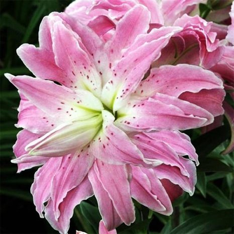 Восточный махровый гибрид. Вегетационный период 100-110 дней. Высота растения 100 см. Цветки густомахровые, крупные (диаметром 20-25 см), без пыльцы, но с ярким и насыщенным ароматом. Лепестки слегка гофрированные по краю, розовые, с малиновым крапом, светлой окантовкой и центром.
