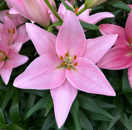 ЛА-гибрид. Вегетационный период 80-90 дней. Высота растения 110-120 см. Цветки направлены вверх, нежно розовой окраски, диаметром 14-18 см.