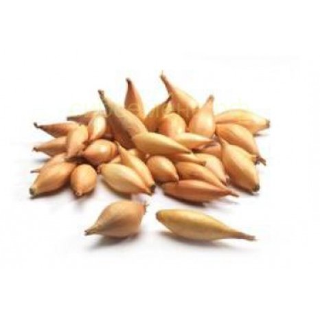 Коричневая луковица несколько вытянутой формы с узким донцем и утолщенной шейкой, кожура – плотная.
