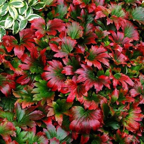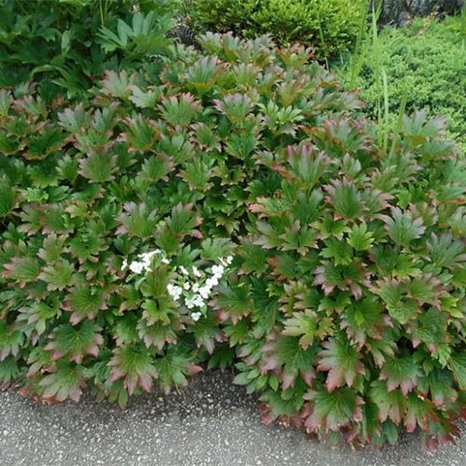 Медленнорастущее растение, высотой до 40 см и шириной до 60 см. Листья дольчатые, по краю зубчатые. Цветки белые, собраны в плотные соцветия, которые возвышаются над листьями. Листья весной имеют бронзово-зелёный окрас, летом становятся тёмно-зелёными с малиновыми кончиками. Осенью мукдения наиболее ярко проявляет свою окраску: листья становятся огненно-красными.