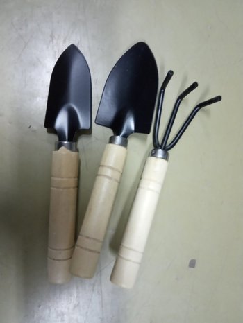 Набор для ухода за комнатными растениями и рассадой, включающий в себя грабельки, совочек и лопатку с толстыми деревянными рукоятками.