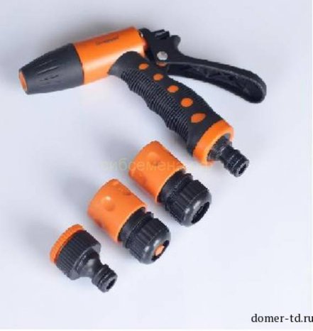 Набор состоит из двух соединителей 1/2, адаптера и пистолета, с помощью регулируемого аксессуара на автоматически регулируемой трубке выполняет орошение туманом, дождеванием и орошением под давлением.