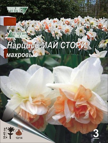 Нарцисс Май Стори (My Story)Махровый. Высота растения 20-30 см. Цветок диаметром 8...10 см. Лепестки околоцветника белые с розовой коронкой. Срок цветения: май - июнь.