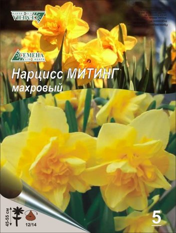 Нарцисс Митинг (Meeting)Махровый, крупноцветный и мощный сорт. Высота растения 20-30 см. Цветок желтый с желтой коронкой, диаметром 10...13 см. Срок цветения: май - июнь.