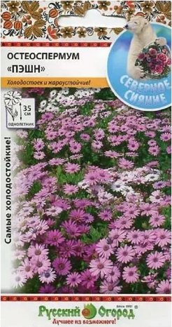 Остеоспермум Пэшн от производителя Русский огород. Это смесь семян белого, нежно-розового с лиловой сердцевиной и оттенка фуксии с темно-бордовой. Холодостойкое однолетнее растение, вырастающее до 35 см в высоту. Период цветения приходится с июня по октябрь. Цветки ромашковидные. Выращивают через рассаду. Предпочитает солнечное место, плодородную почву, дренаж, полив.