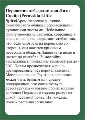 Перовския Литл Спайр травянистый многолетник, у которого в равной степени привлекательны и куртины-кустики, и цветение. Хотя в большей мере ценят это растение именно за длительное и красочное цветение. В высоту кустики достигают 60 см, а иногда и 1 м. Побеги многочисленные, тонкие и прямые, жесткие, устойчивые. Листья у перовский узколанцетные или рассеченные, всегда вытянутой формы, темного приглушенного окраса.Цветки растения очень мелкие и были бы неприметными, если бы не стройные метелки соцветий и прохладный, синевато-лиловый окрас, который придает куртинам особую эффектность. Благодаря окрасу это растение считается одной и лучших культур для имитации воды, создания эффекта синей прохлады и колышущихся волн в саду. Кустики перовские и правда как будто укутаны синим туманом. Все части растения очень ароматны, но ценят перовскию не только как источник эфирных масел и прекрасный душистый сухоцвет. Ведь и цветки, и листья растения съедобны и могут использоваться и как приправа, и в готовке самых разнообразны