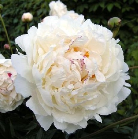 (Boule de Neige) молочноцветковые Высота растения до 100 см. Цветки махровые розовидные, белые, с жёлтыми насыщениями и красными окаймлениеми на некоторых лепестках, диаметром 18 см. Цветение июнь-июль.