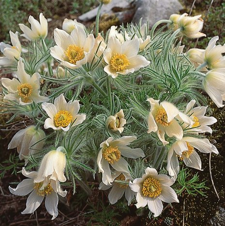 Прострел обыкновенный Уайт Беллс (Pulsatilla vulgaris White Bells) Высота растения 25 см. Листья серебристо-белые, опушенные. Цветки крупные, колокольчатые, белой окраски с многочисленными желтыми пыльниками.
