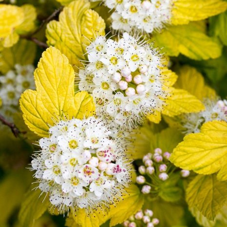 Кустарник высотой до 2-2,5 м с густой округлой кроной, образованной вертикальными, слегка раскидистыми ветвями. Побеги - красновато- или розовато- коричневые. Листья 3-5 лопастные, яркие, лимонно-желтые, в центре куста - желто-зеленые. Осенью - золотисто-желтые. Период цветения июнь-июль. Цветки бело-розовые, в щитковидных соцветиях. Плоды вздутые, бурые. Темп роста быстрый.
