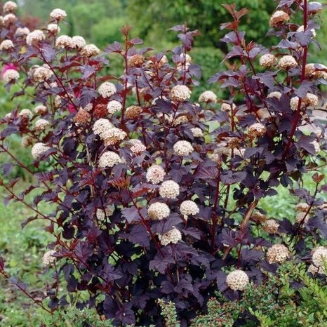 Растёт он в виде плотного, слегка развесистого многоствольного куста с многочисленными косо восходящими от основания побегами высотой до 2,5 м. Листья темно-пурпурные, размером и формой напоминают листья калины или смородины. Цветки белые, мелкие, в плотных полушаровидных конечных соцветиях. Цветёт кустарник с конца мая в течение 20 дней. Плоды – вздутые листовки, зелёные сначала и краснеющие при созревании.