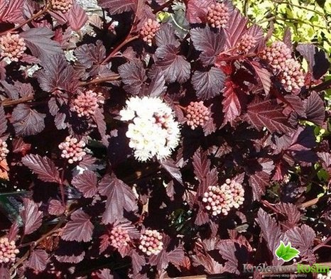 Пузыреплодник калинолистный Шух – прямостоячий кустарник. Молодые листья с переливчатой окраской, ярко-красно-глубоко бордовые. Цветки мелкие, от белого до розоватого цвета и образуют полусферический зонтик. Цветет в июне. Высота до 2 м. сорт зимостоек. Растение высаживают в качестве бордюров, среди многолетников.