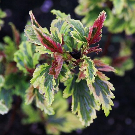 Сорт пузыреплодника Хамелеон относится к калинолистным разновидностям. Используется он преимущественно в ландшафтном дизайне – как для конструирования живых изгородей, так и для групповой посадки. Срок жизни данного пузыреплодника составляет от 30 до 40 лет. Сорт Хамелеон формирует небольшой раскидистый кустик, высота которого достигает 150 сантиметров. Ширина быстрорастущего растения также составляет 150 сантиметров. Прямостоячие побеги формируют плотную округлую крону, покрытую мелкими листочками. Цветение пузыреплодника сорта Хамелеон приходится на июнь и сопровождается возникновением кремово-белых или розовых цветочков. Распахнутые бутоны радуют, вплоть до осени, а по завершении сезона сменяются на шарообразные плоды