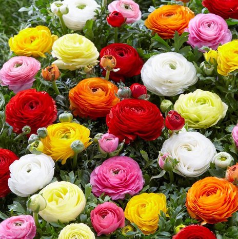 Ранункулюс азиатский Смесь (Mixed) Смесь махровых лютиков разнообразной окраски: белой, желтой, красной, голубой, оранжевой, розовой. Месторасположение: светлое (не переносит полящее солнце), безветренное место.