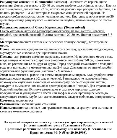 Ранункулюс азиатский (Ranunculus asiaticus) - многолетнее корневищное растение. Достигает в высоту 30-40 см, имеет глубоко рассечённые листья. Цветки густо махровые, диаметром 5-7 см, похожи на розочки при раскрытии бутонов, а в полном роспуске - на миниатюрные махровые маки различной окраски. На каждом стебле распускается по несколько цветков. Цветение длится в течение 30 дней. Корневища ранункулюса — небольшие клубни, напоминающие по форме паучка.