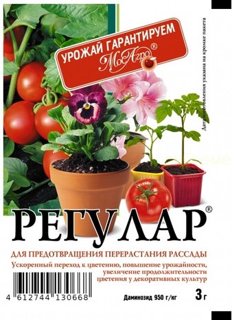 Предотвращение перерастания рассады 0,5г/л воды. Цветочные культуры - снижение высоты растений, формирование компактного куста, повышение декоративных качеств, продление периода цветения 3-6г/л воды.