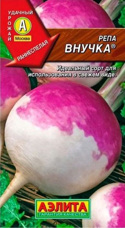 Раннеспелый сорт (от всходов до технической спелости - 45-50 дней), с дружным формированием урожая. Корнеплод обратнояйцевидный. Масса корнеплода -300-330г. Кора светло-фиолетовая, нежная, гладкая. Мякоть белая, плотная, очень сочная, сладкая. Вкусовые качества отличные. Корнеплоды используются в свежем виде, для приготовления салатов, пригодны для хранения в осенне-зимний период.