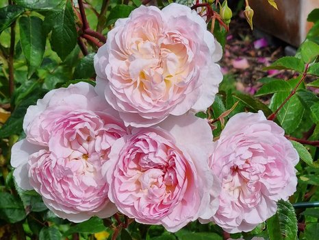 Сорт устойчив к болезням! Непритязательная роза мягкого розового цвета; её лепестки бледнее с обратной стороны и их оттенок светлеет к краю, создавая общее очень нежное впечатление. Растущие на красноватых стеблях чашевидные цветы среднего размера и достаточно свободной формы отличаются почти гофрированными лепестками, расположенными вокруг симпатичного «глазка». Роза имеет средне-сильный аромат старинной розы с нотами фруктового лимона, зеленого банана и абрикоса. Очень здоровый куст среднего размера с блестящей темно-зеленой листвой, широкорастущий, с изогнутыми побегами, высотой 105 см и шириной 135 см.