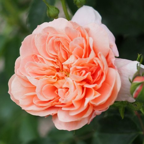 Крупные ароматные цветки, сначала чашевидные, но позднее меняют форму. Так же меняется окраска цветка - от бледно-абрикосовой до более светлой по краям, оборотная сторона лепестков всегда бледнее. Куст мощный, сильнорослый, вырастает до 180 - 200 см с некрупной, темно-зеленой, глянцевой листвой. Цвет обильно, повторно, цветки собраны в небольшие соцветия, на одном цветоносе 3-5 цветков.