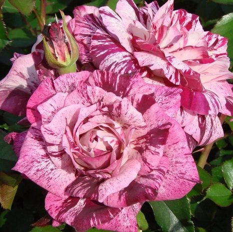 Особенностью "Purple Tiger" является его неповторимый окрас: сочетание бордовых и кремовых оттенков в полосатом узоре. Цветки этого сорта, собранные в соцветия по 3-5 бутонов, не оставляют равнодушными благодаря своей уникальной расцветке и фиолетово-пурпурному доминированию над более светлыми тонами. Цветение непрерывное и обильное, радуя взгляд на протяжении всего сезона.Цветки "Purple Tiger" полумахровые, достигают в диаметре 8-10 см и излучают легкий цитрусовый аромат с нотками мускуса, добавляя саду не только визуальную, но и ароматическую привлекательность. Кустарник прямостоячий, вырастает до 80-100 см в высоту, что делает его идеальным для групповых посадок, а также для выращивания в качестве солитера.