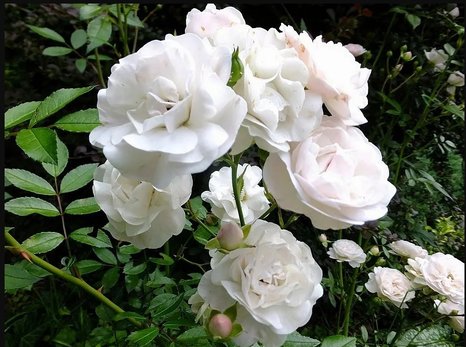 Сиа Фом - цветки белые, с розово-жемчужным оттенком в центре, густомахровые. Зацветает поздно, но затем цветет непрерывно до поздней осени. Листва мелкая, блестящая, темно-зеленая. Куст сильный, с длинными полу-стелющимися побегами до 100 см длинной. Можно использовать, как невысокую плетистую розу.