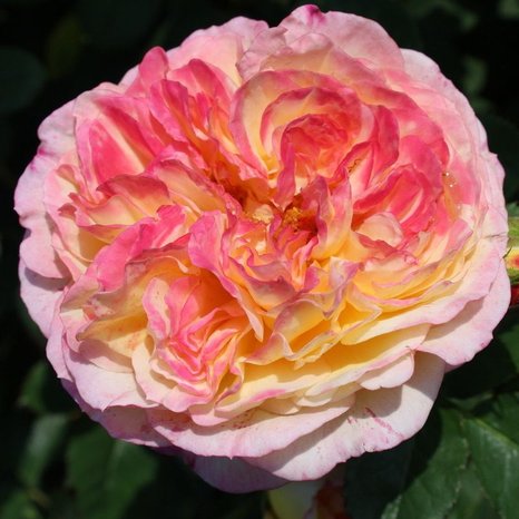 Куст рослый, до 100-120 см в высоту, ветвистый, но стройный, до 60 см в диаметре, с прямыми жесткими ветвями. Есть колючки.Форма цветков – глубокая чаша. Цветок густой, с округлыми лепестками, число которых может достигать 60. Цветы крупные, до 12 см в диаметре, размер нестабилен, может зависеть от условий выращивания и возраста растения. Очень нежный желтый оттенок с шафрановыми тенями постепенно сменяется розовым. Распределение окраски оригинально: цветок будто макнули в розовую краску, и она мягко впиталась в центр и кончики лепестков. Розовый цвет проявляется постепенно, по мере роспуска цветов. Устойчивость цветков к дождю низкая. Аромат средней, мягкий, фруктовый.