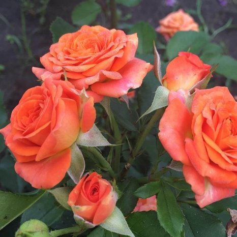 Сорт обильноцветущий! Очень красивая и обильно цветущая спрей роза. Куст высотой 70-100 см, ширина 60-90 см. Цветки размером 4-7 см, оранжевого цвета. В соцветии 5-10 цветков. Сорт среднеустойчив к мучнистой росе.