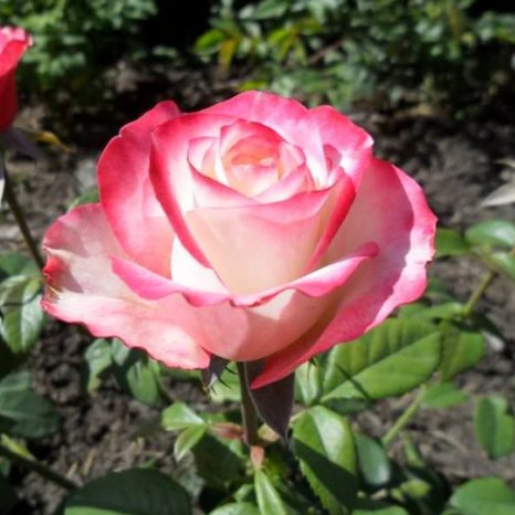Чайно-гибридная. Куст высотой 70-100 см. Ширина куста 50-75 см. Цветки крупные, диаметром 9-11 см, бокаловидной формы, густомахровые (до 60 лепестков), бело-кремовой окраски с вишневой окантовкой. Аромат нежный, едва уловимый. Хорошая устойчивость к болезням и дождю.
