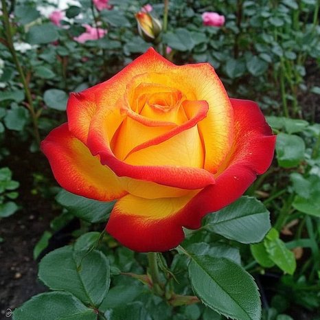 Роза Еллоу Магия чайно-гибридная - имеет цветок ярко-желтого цвета с красной неравномерной окантовкой. Диаметр цветка 8-10 см. Высота куста до 80 см. Бутон бокаловидный, при полном раскрытии приобретает чашевидную форму. Листва густая, блестящая. Обладает устойчивостью к черной пятнистости и мучнистой росе