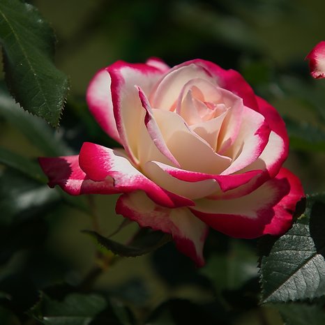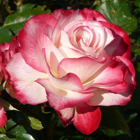 Jubile du Prince de Monaco Эта эффектная роза покоряет красотой цветка. В полуроспуске бело-кремовые лепестки окантованы нежной малиновой каймой, которая по мере раскрытия цветка расширяется, а ее интенсивность усиливается до вишневой. Цветки крупные, махровые, долго сохраняют прекрасную форму. Компактные кусты высотой до 80 см, с плотной матовой листвой, выглядят опрятно в любое время. Прекрасная роза для небольших групп и массивов, в сложных посадках можно использовать как переход внутри красной гаммы.