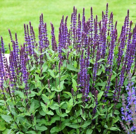 Сальвия дубравная Карадонна (Salvia nemorosa Caradonna) Высота растения 50 см, ширина 30 см. Сорт с чёрно-фиолетовыми стеблями, серо-зелёными ароматными листьями. Цветки фиолетово-синие. Цветёт в июне-августе.