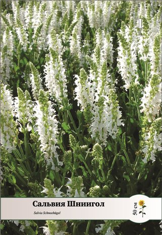Сальвия дубравная Шниигол (Salvia nemorosa Schneehügel) Высота растения 50 см, ширина 30 см. Сорт белыми цветками. Цветёт в июле-сентябре. Месторасположение: светолюбива.