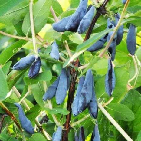 Жимолость Длинноплодная– съедобная. Листопадный многолетний кустарник. Высота 1,2м, диаметр 1,5 м. Побеги мощные, ровные, с легким пушком. Листья продолговатые и ланцетные , черешки короткие. Самобесплодный. Ягода веретеновидная, бугристая, синяя с восковым налетом, 0,8 - 1,1 гр., вкус сладкий, с кислинкой, илегким послевкусием. Опылители сорт Голубое веретено, Амфора, Виола, Морено.